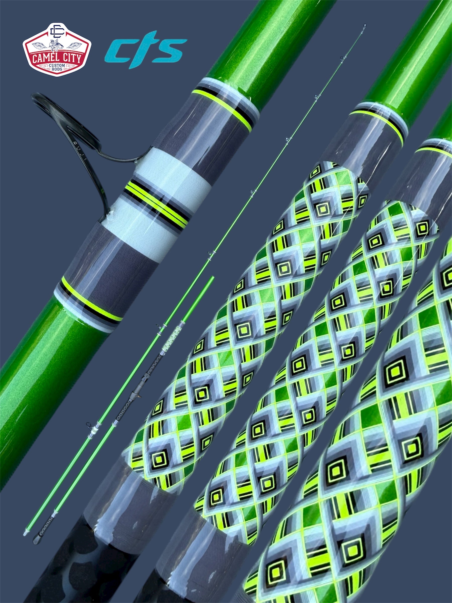 Open 6 axis wrap with neon yellow & black with shades of grey. Handle 30” butt to rear of trigger seat. Fish scale split grips with Fuji BCMNAG25 to 12 guides. Federal Excise Tax of $10 is included in price.